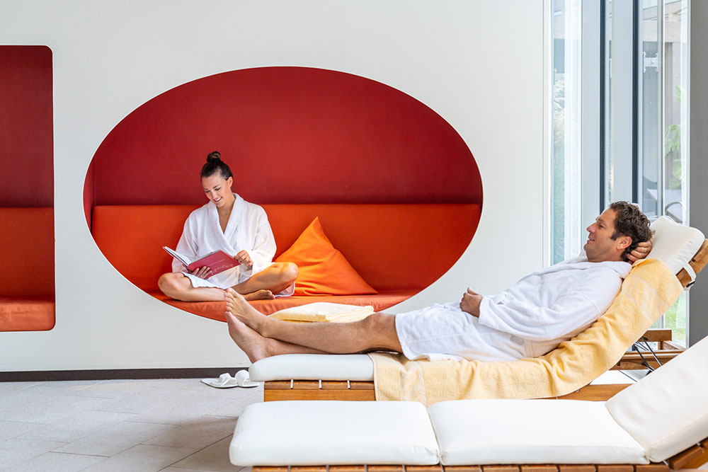 In unserem Spa-Bereich finden Sie zahlreiche wunderbare Plätze zum Entspannen. Egal ob Sie auf einer der Liegen ein gutes Buch lesen, sich auf der Liegewiese von der Sonne bescheinen lassen oder im Ruheraum einfach meditativ ins Feuer schauen möchten – unser Spa-Bereich ist die reinste Ruheoase.