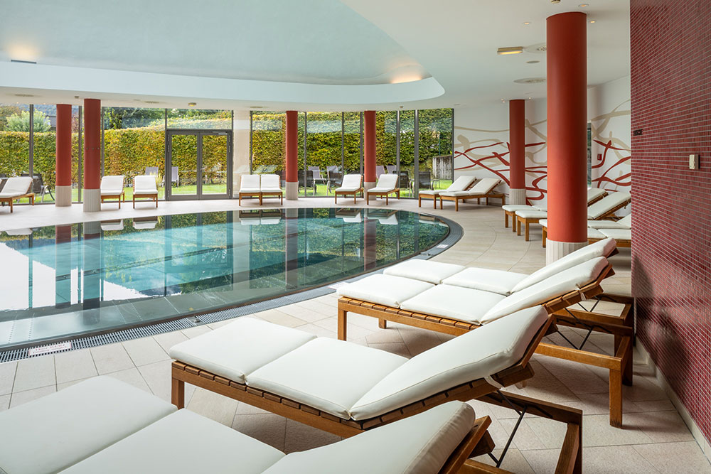 Der ca. 80 m² große Indoor-Pool ist das Herzstück des Villa Seilern Spa-Bereichs. Im wohltemperierten, 31,5 °C warmen, energetisch angereicherten Granderwasser können Sie genüsslich ein paar Längen schwimmen. Acht Massageliegen und zwei Jet-Düsen für den Rücken bieten zusätzliche Entspannung und Wellness-Vergnügen.